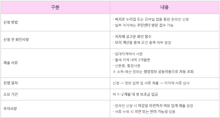 | 유형 2 | 임차보증금 8천만 원 이하, 월세 60만 원 이하 | 월 20만 원 지원 |